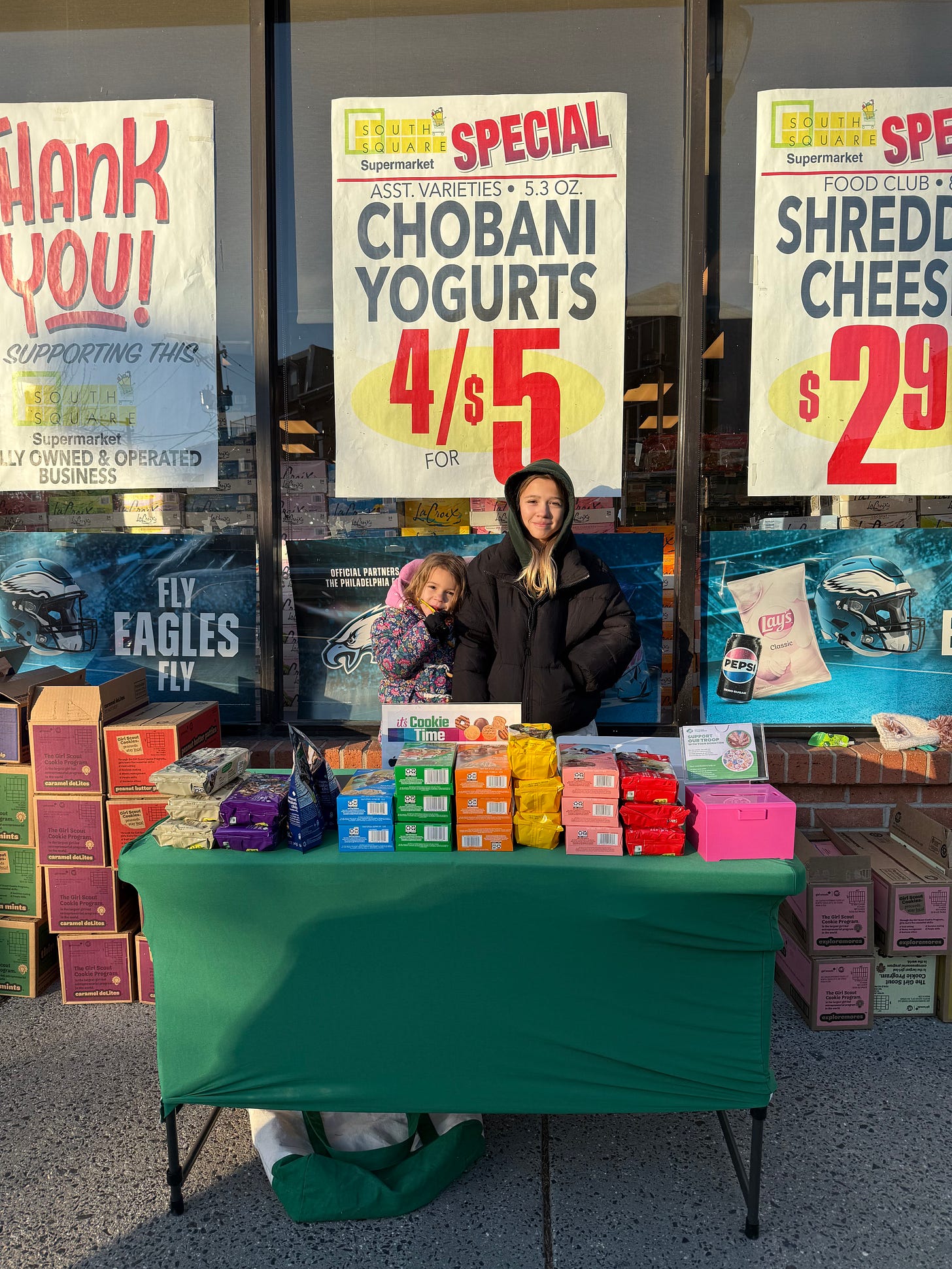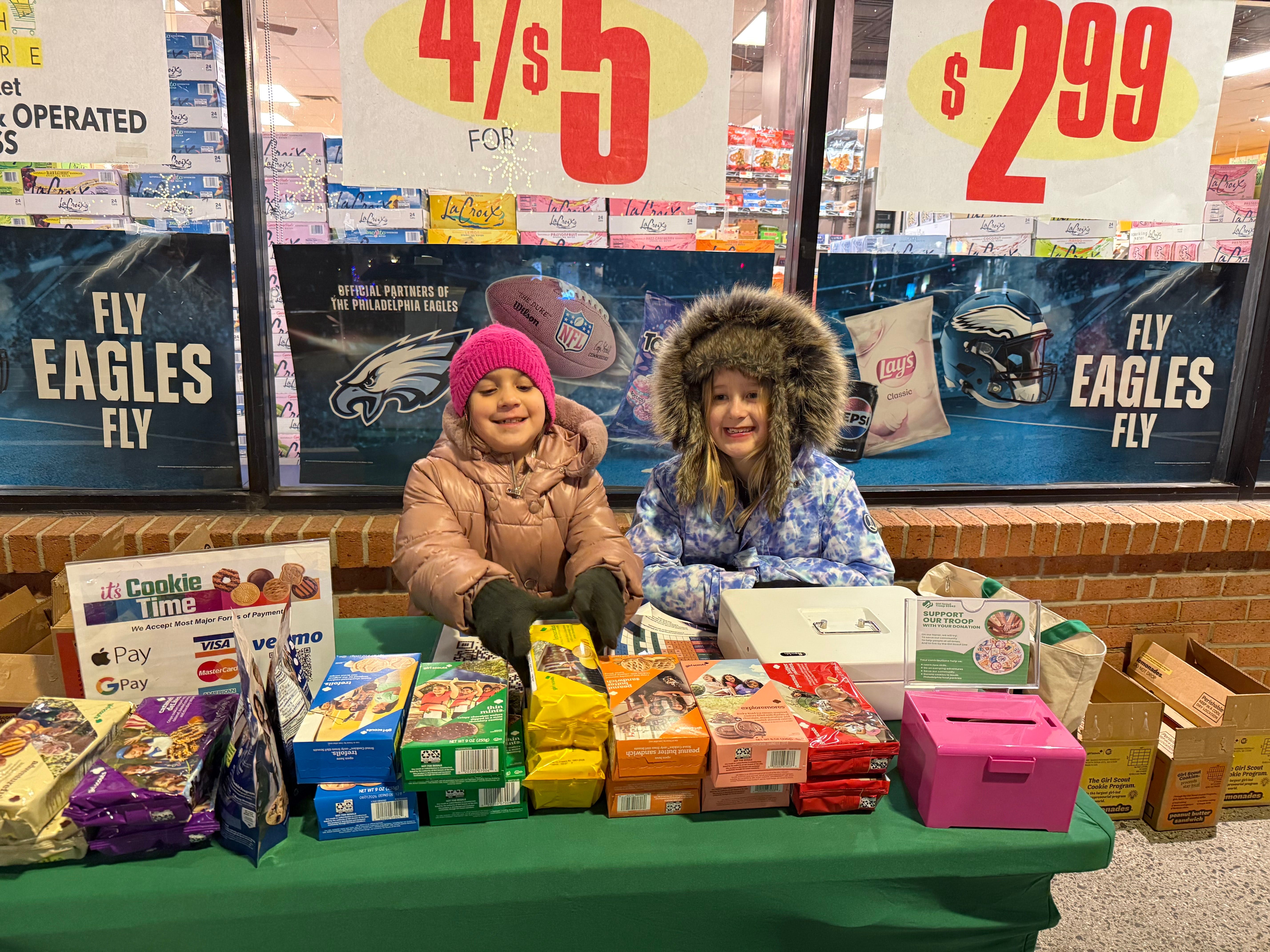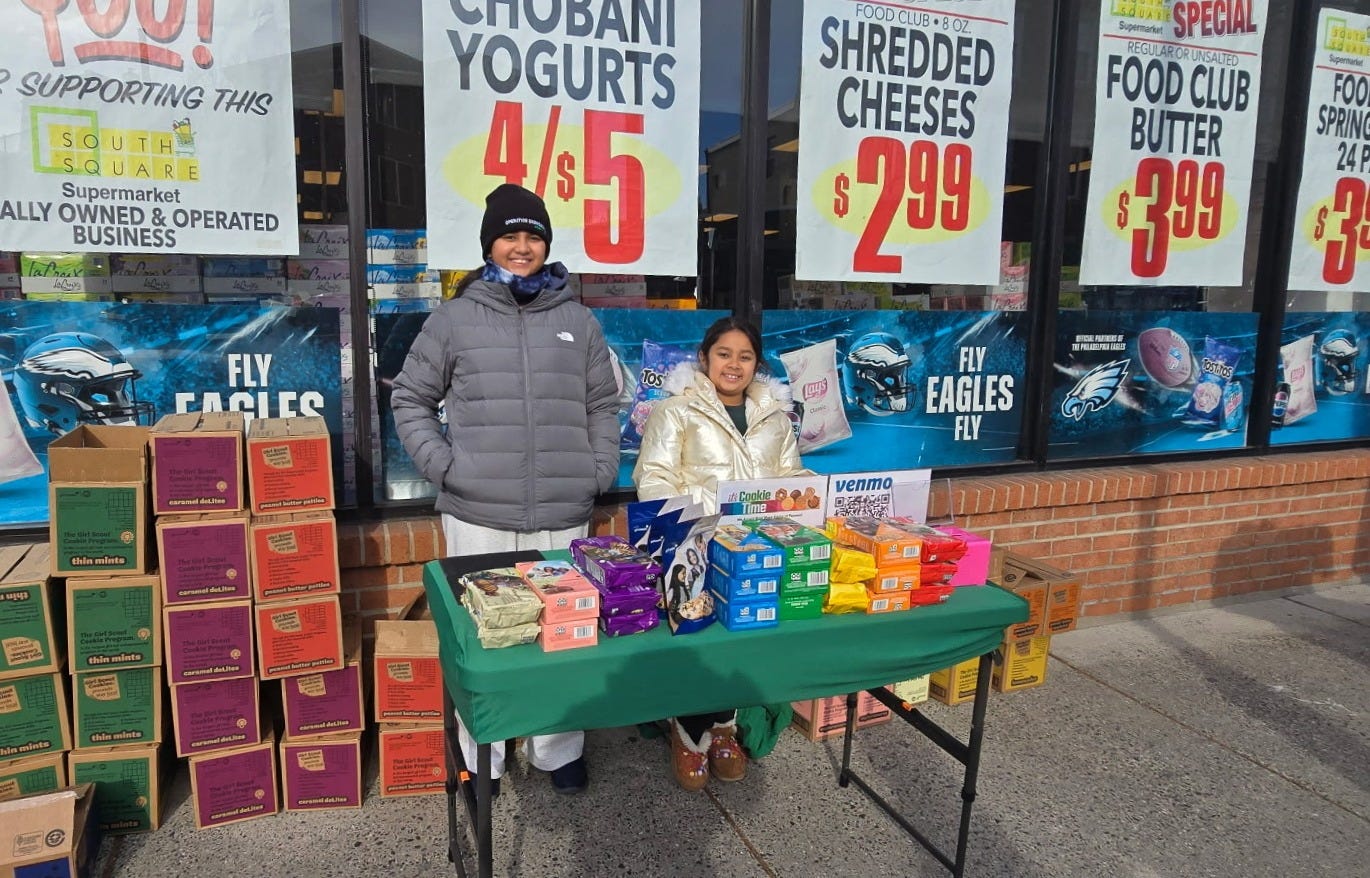 On winter weekends, the Girl Scouts outside South Square Market have become a Fitler Square constant: the same folding table, the same bright stacks, and, increasingly, the same faces. Troop 93942 has sold there for nine years, long enough that some of the girls now working the front line began when they were barely tall enough to see over the boxes.