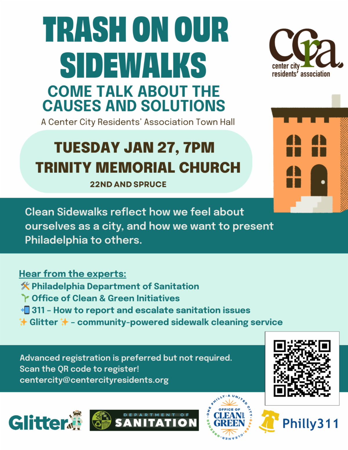 In response to growing concern, CCRA is hosting a public town hall focused on trash and sidewalk cleanliness. The meeting is scheduled for tomorrow, January 27 at 7 p.m. at Trinity Memorial Church at 22nd and Spruce Streets. Expected attendees include reps from the Philadelphia Department of Sanitation, the Office of Clean and Green Initiatives, and the city’s 311 system.