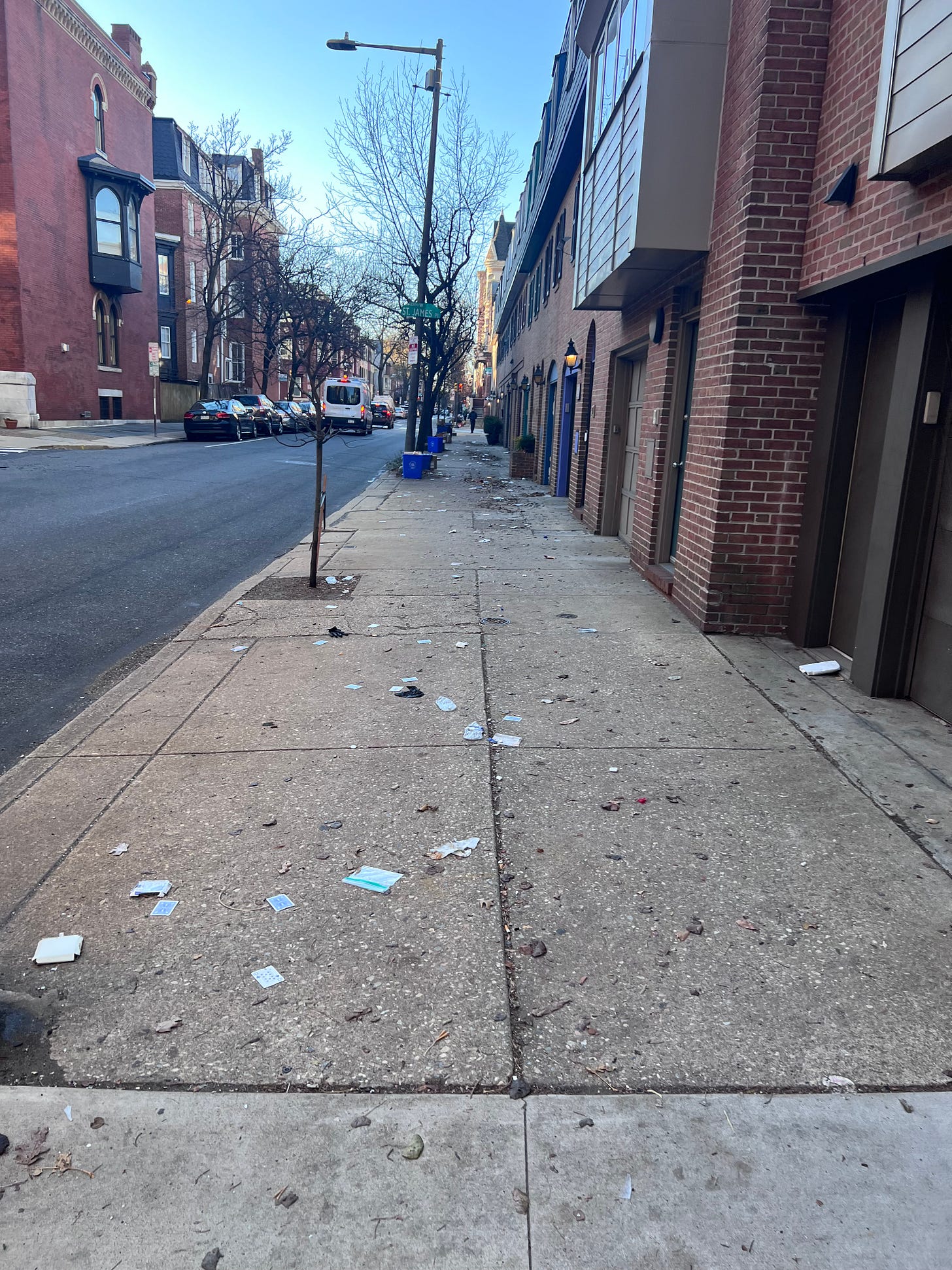 The Center City District continues to sweep sidewalks within its assessed commercial catchment area, which is funded by mandatory property assessments. Residential streets outside that boundary are now dependent on city sanitation services and individual compliance with trash regulations.